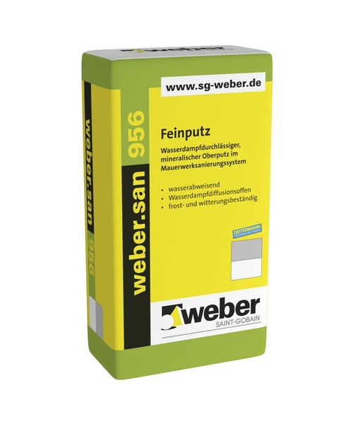 Weber.san 956 (Deitermann FP) jest dyfuzyjnym, drobnoziarnistym tynkiem mineralnym do zastosowań zewnętrznych i wewnętrznych.